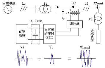 在電源和負載之間串聯一只補償變壓器,通過補償變壓器的初級線圈的逆變器向負載側提供同頻、鎖相、幅值可變的補償電壓保持輸出電壓的穩定。